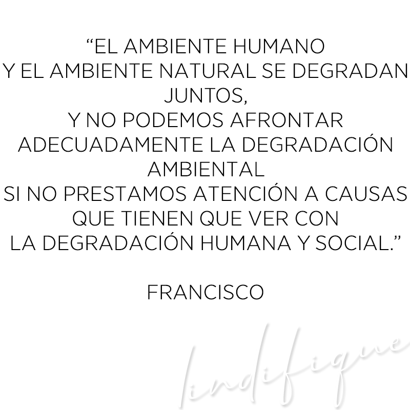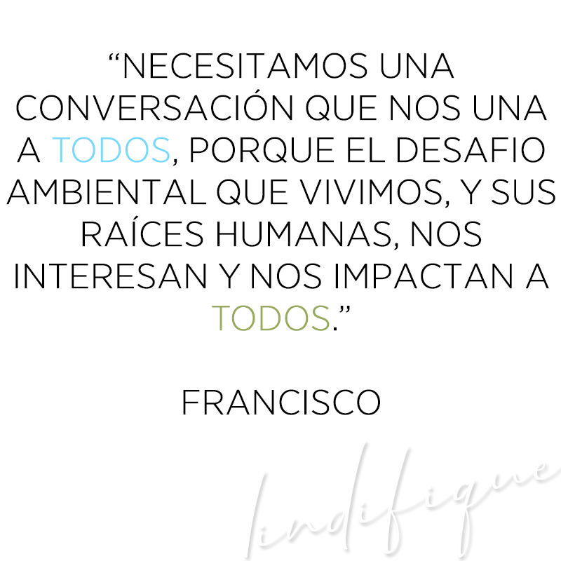 Nos habla entonces de los problemas que como raza humana hemos creado para nuestro planeta: el consumismo, el antropocentrismo, el descarte. Y nos invita a un nuevo modelo de vida, en que el más pobre sea respetado desde su derecho a no ser afectado por el cambio climático, en que pensemos en el bien común, en la justicia para las generaciones futuras, el papel de los tomadores de decisiones, y cómo entre todos tenemos el deber no solo moral, sino también religioso, de proteger nuestra casa común.